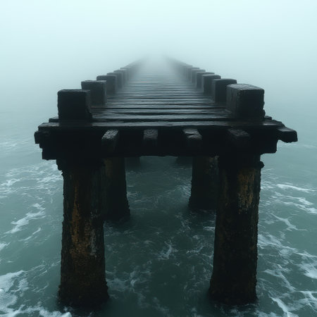 A weathered pier stretches into a dense fog, surrounded by calm, misty waters at dawn.