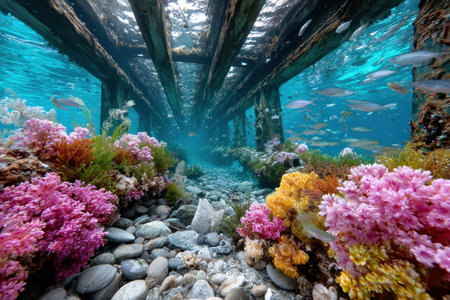 Colorful coral and fish thrive beneath a weathered wooden pier