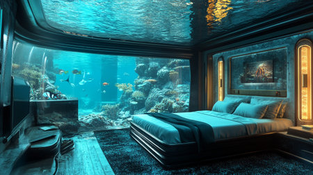 Luxurious underwater bedroom with panoramic ocean views and vibrant marine life display