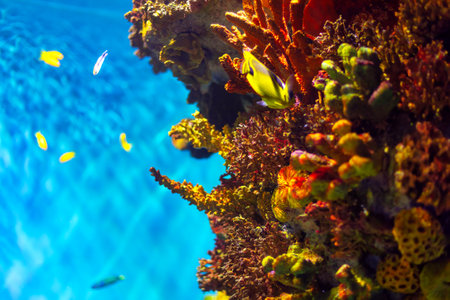 Sun shining through sea water surface on fishes swimming at ocean bottom. Abstract underwater background or backdrop.