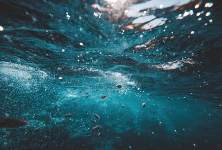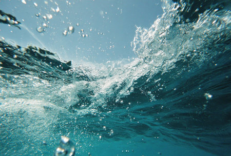 Underwater shot capturing rising air bubbles, a glimpse below the ocean's surface