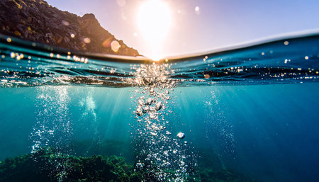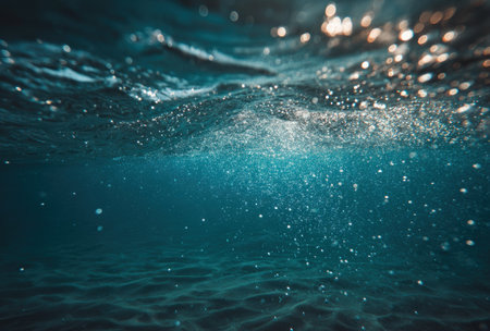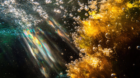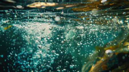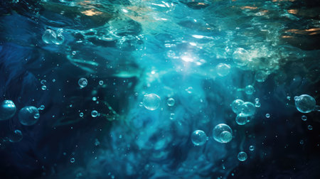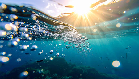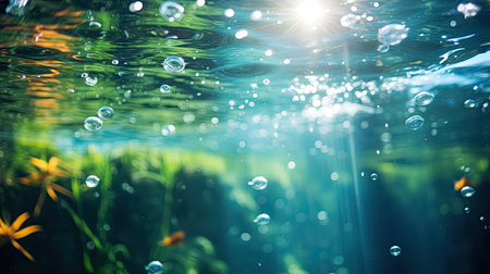 Captivating underwater scene showcasing shimmering bubbles and sunlight filtering through water, creating a serene atmosphere and vibrant aquatic beauty.