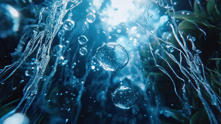 a close up of a bunch of bubbles in the water with a light shining on the bottom of the bubbles and the bottom of the water. . generative ai