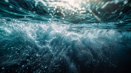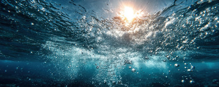 Underwater shot capturing sunlight filtering through the water's surface, with bubbles rising and creating a dynamic visual.
