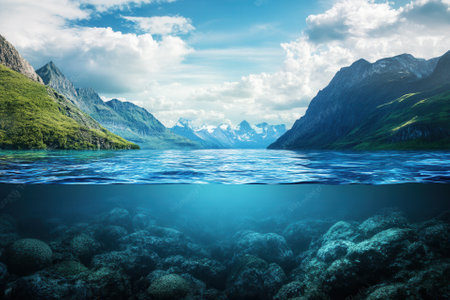 Serene underwater landscape with mountains above water.