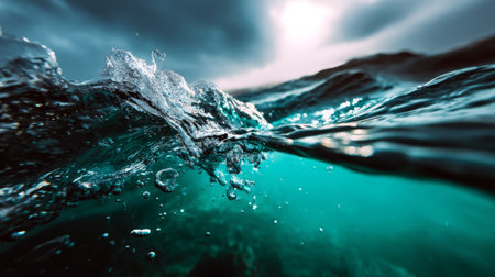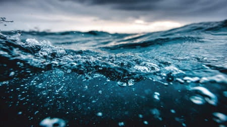 Dynamic wide shot capturing a splash on the ocean surface with visible underwater clarity and a moody cloudy sky in the background. Highlights natural water motion and dramatic lighting.