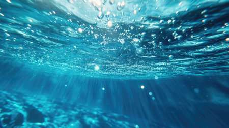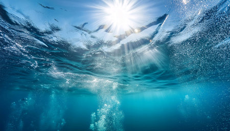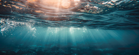 Underwater view with sun rays shining through the water surface, creating a beautiful and dynamic scene with bubbles.