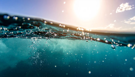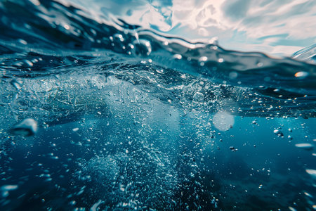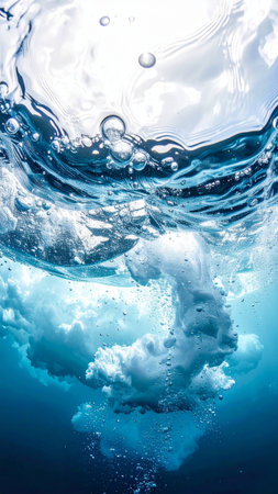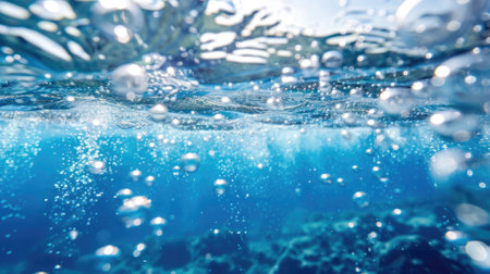 Clear blue water with oxygen bubbles rising and sparkling light reflections, evoking a sense of freshness and purity.