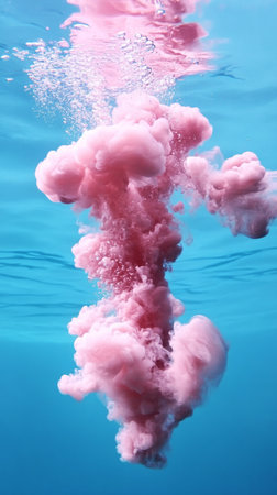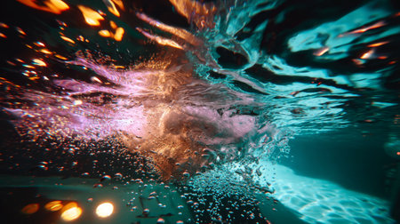 An expressive underwater scene with bubbles and flowing energy from an impact, lit in glowing teal and pink. The dynamic moment captures the effect of sound or motion through liquid.
