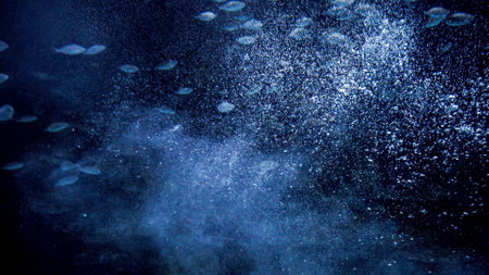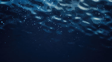 An underwater perspective reveals a dark blue environment filled with numerous bubbles. The composition captures the interplay of light filtering down, illuminating the scene. This tranquil visual can be used for various editorial or commercial projects. The textures create a sense of depth and immersion, inviting viewers to explore the depths.