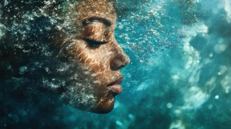 A young woman floats peacefully underwater, her eyes gently closed.