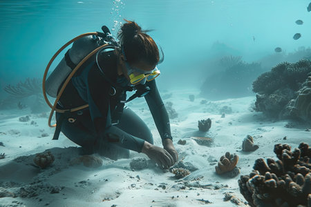 Reef Restoration, Diver Plants Small Corals on Ocean Floor, Restoration of Dead Corals, Coral Plantation, Generative AI Illustration