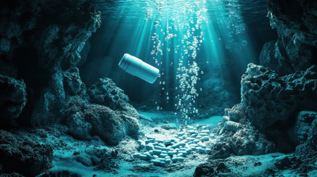 A glowing blue underwater scene where a pill bottle descends, pills and bubbles rising in contrast.