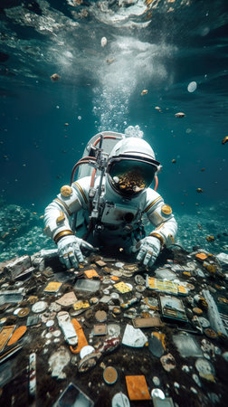 An AI generated illustration of an astronaut swimming in an ocean covered in litter and trash