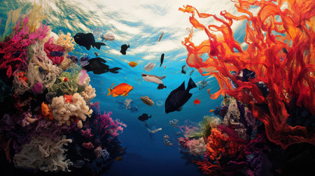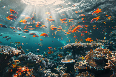A colorful coral reef with many fish swimming around. The fish are of various colors and sizes, and the reef is teeming with life. Concept of vibrancy and abundance, as well as the beauty