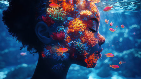 A man's profile is artistically intertwined with an underwater scene showcasing a colorful coral reef and diverse fish swimming amidst the vibrant aquatic environment.