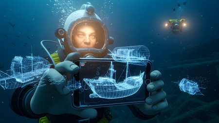 Deep sea diver utilizing advanced holographic technology for underwater city and shipwreck mapping