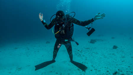 Young caucasian diver floating underwater in blue sea