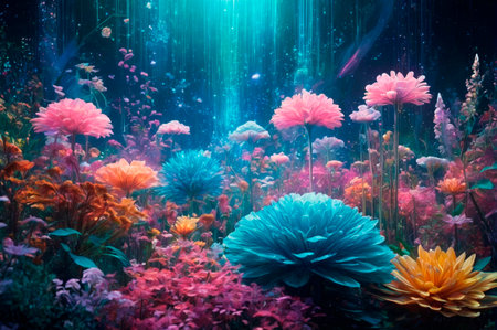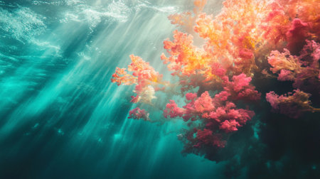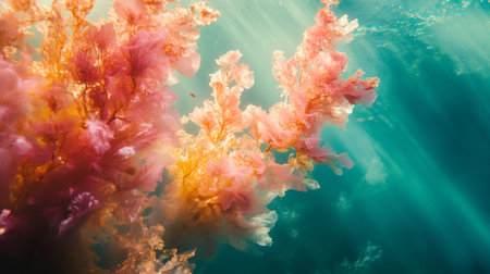 A stunning display of vividly colored aquatic plants and flowers creates an enchanting underwater atmosphere.