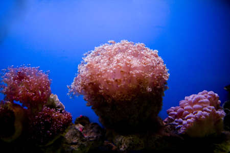 pink Tube anemone at the bottom of the aquarium on the blue background. Marine fish concept Ichthyology concept