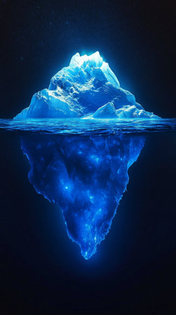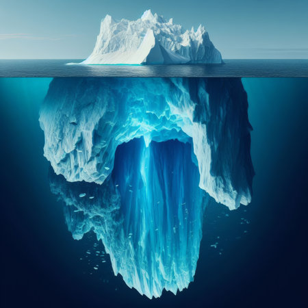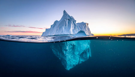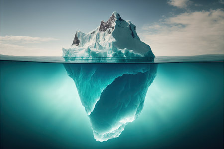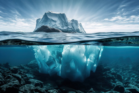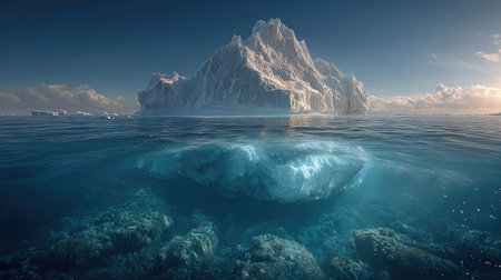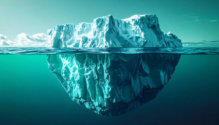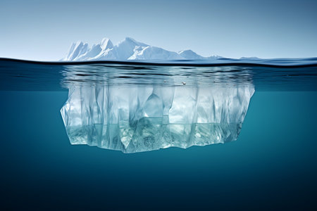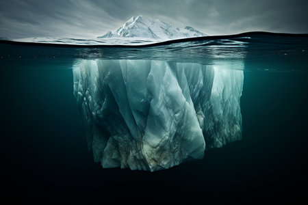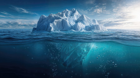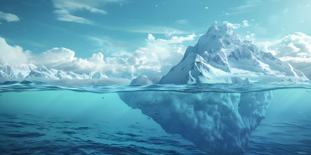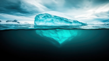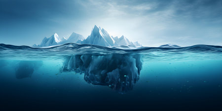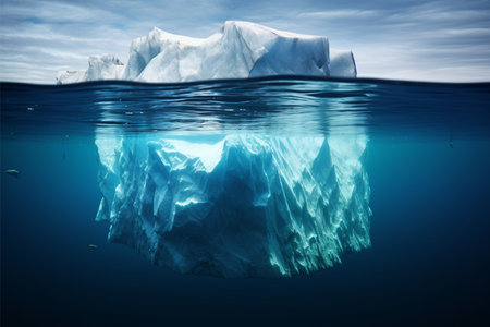Dramatic split view of a huge white iceberg floating in the deep blue ocean. Shows the small visible tip above the waterline and the massive hidden structure below, symbolizing risk, hidden problems, or climate change