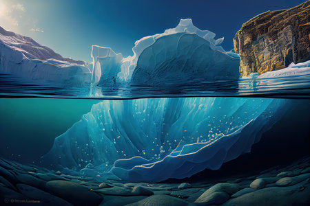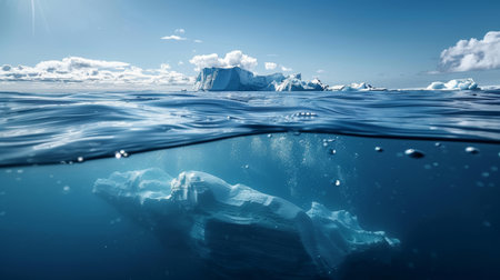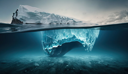 Split View of iceberg in blue ocean, showing vastness beneath the surface