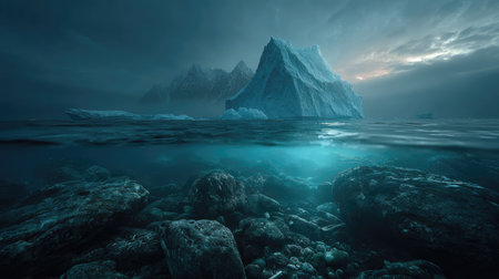 This breathtaking image captures a massive iceberg rising from deep ocean waters, accented by rocky seabed and dramatic twilight clouds, evoking serenity and awe.