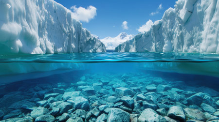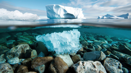 Breathtaking view of a polar environment featuring towering icebergs above and a crystal-clear rocky seabed below the water's surface.