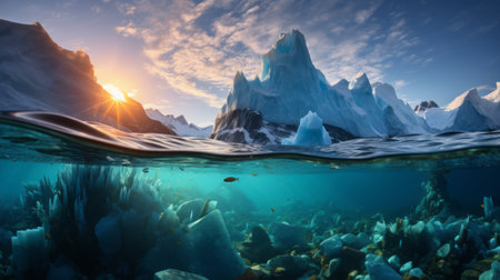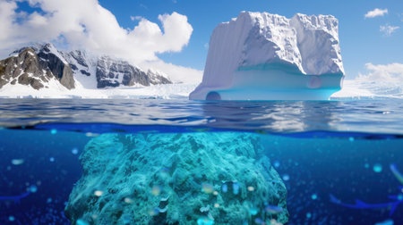 This captivating image showcases a magnificent iceberg above a serene ocean, revealing a vibrant underwater scene with colorful aquatic life.