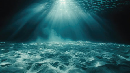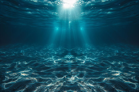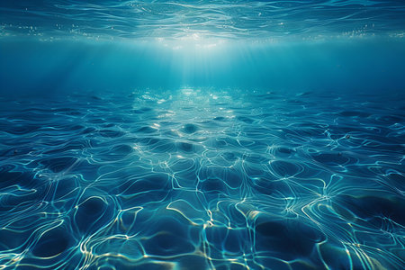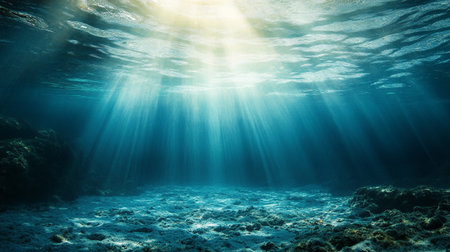 Underwater scene with sunbeams and blue sea, underwater background
