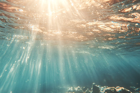 Sunbeams illuminate the crystal-clear turquoise water, creating a mesmerizing spectacle of light and shadow beneath the surface, offering a glimpse into the serene beauty of the underwater world