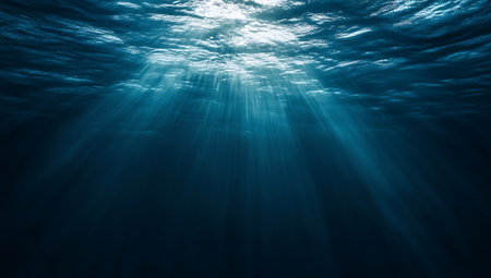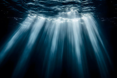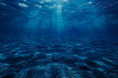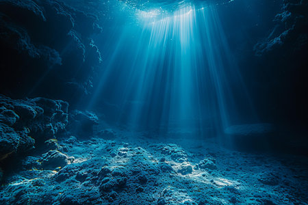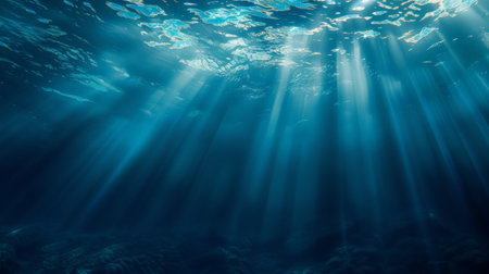 Underwater view of the deep blue sea with sunlight rays passing through.