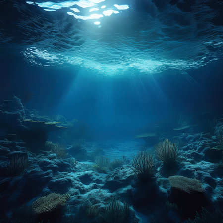 A view of the bottom of the sea or ocean with sunlight penetrating from the above