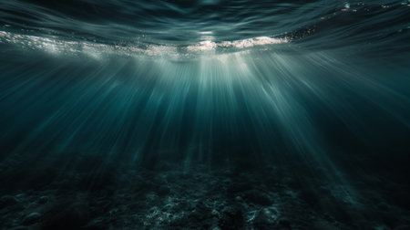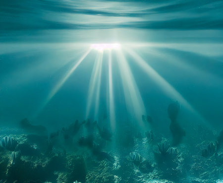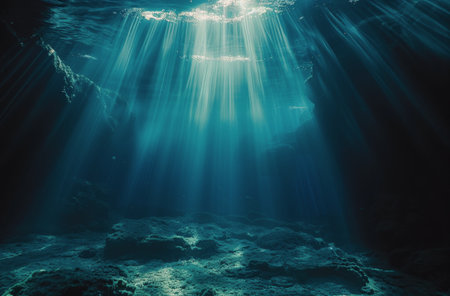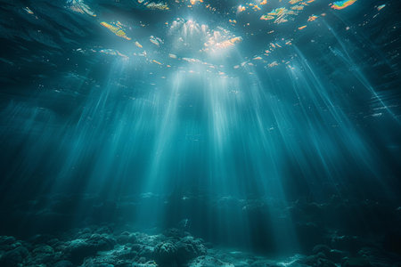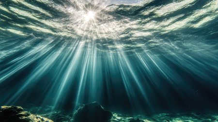 Underwater scene with sunbeams shining through the water surface.