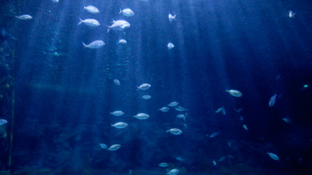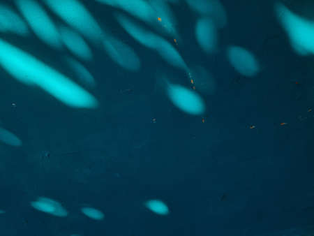 Sun shining through sea water surface on fishes swimming at ocean bottom. Abstract underwater background or backdrop.