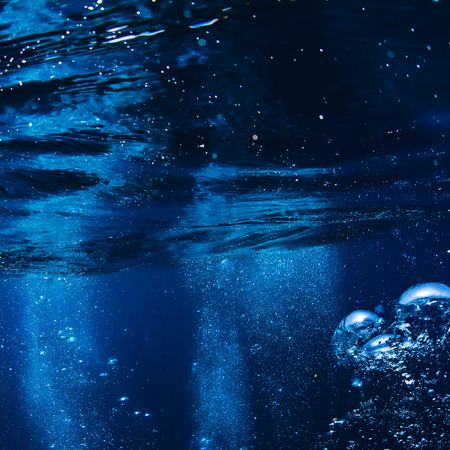 air bubbles in clean clear sea blue water with sun rays