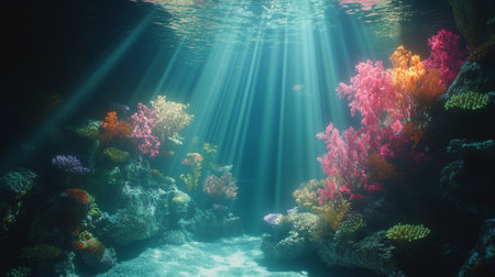 Underwater view of coral reef with sunbeams and rays of light