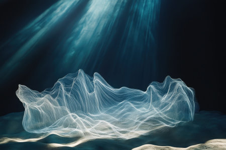 Light beams penetrate water, revealing a mesmerizing underwater formation with flowing particles.