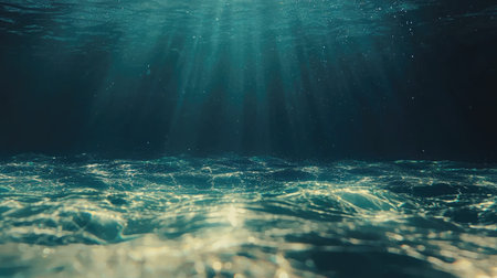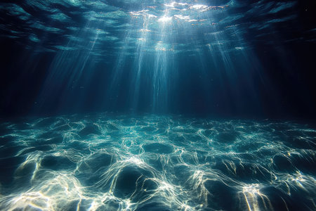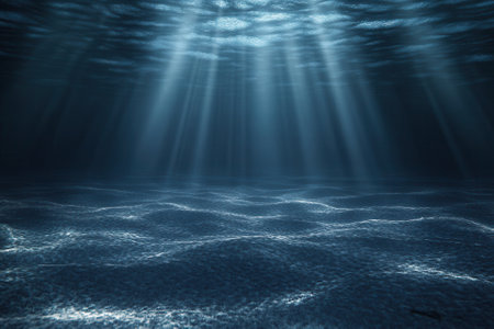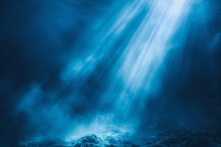 An immersive underwater view displays a deep ocean environment. Sunlight streams pierce the surface, illuminating particles and creating dramatic light patterns. The scene is characterized by a dark blue palette and textures suggestive of water and seabed. Ideal for concepts of exploration, mystery, and environmental themes.