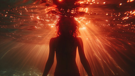 Captivating Underwater Moment at Sunset With Ethereal Light Illuminating a Silhouette of a Person Immersed in Natures Beauty