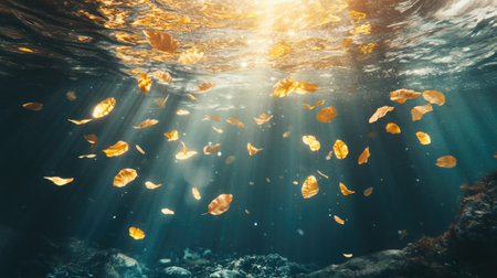 This captivating underwater scene captures golden leaves floating gracefully beneath a shimmering water surface, illuminated by radiant sunlight beams.