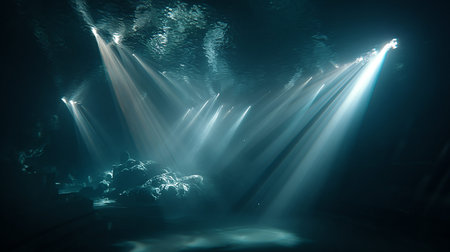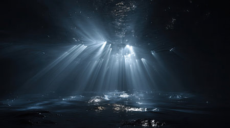 This captivating image showcases ethereal light rays breaking through dark waters, creating a tranquil underwater scene that evokes a serene and magical atmosphere.