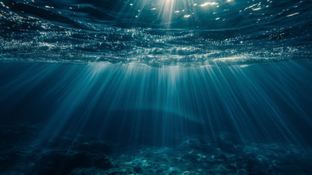 Rays of sunlight are creating beautiful beams underwater, illuminating the deep blue ocean with a mesmerizing and ethereal glow