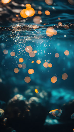 This captivating underwater scene features radiant sunlight piercing through the surface, casting beautiful reflections on gentle waves, creating a tranquil atmosphere.