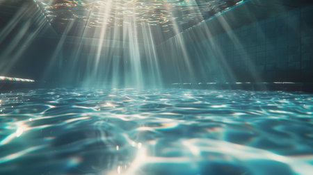A 3D rendering showing an empty swimming pool underwater, with light rays and glare.