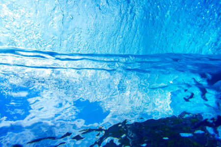 Wave underwater. Blue barrel wave crashing in ocean and sunlight.