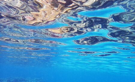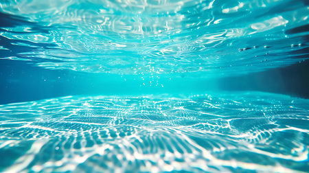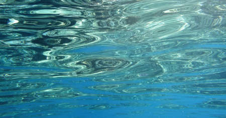 Defocused shot of clear blue water with gentle ripples and bubbles on the surface. Sunlight creates a shining, textured pattern beneath the calm waves.