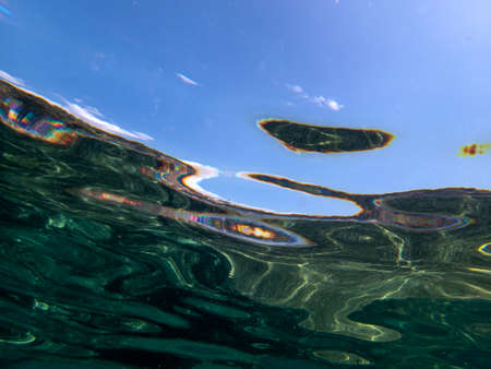 Surface of blue ocean with sky and sunlight underwater in Hawaii