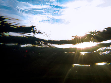Submerged view capturing rippled sunlight filtering into a dark pool