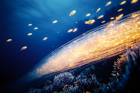 Fiber optic cable transmitting data underwater, illuminating the surrounding coral reef and attracting fish, symbolizing the intersection of technology and nature
